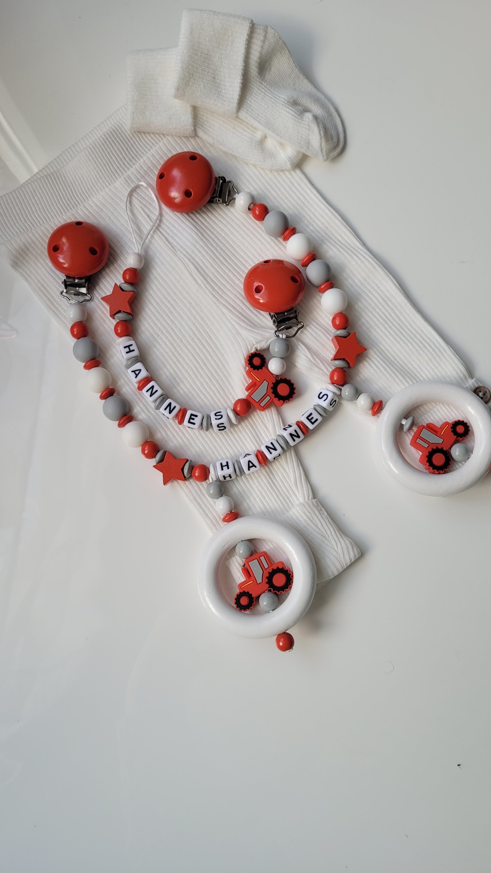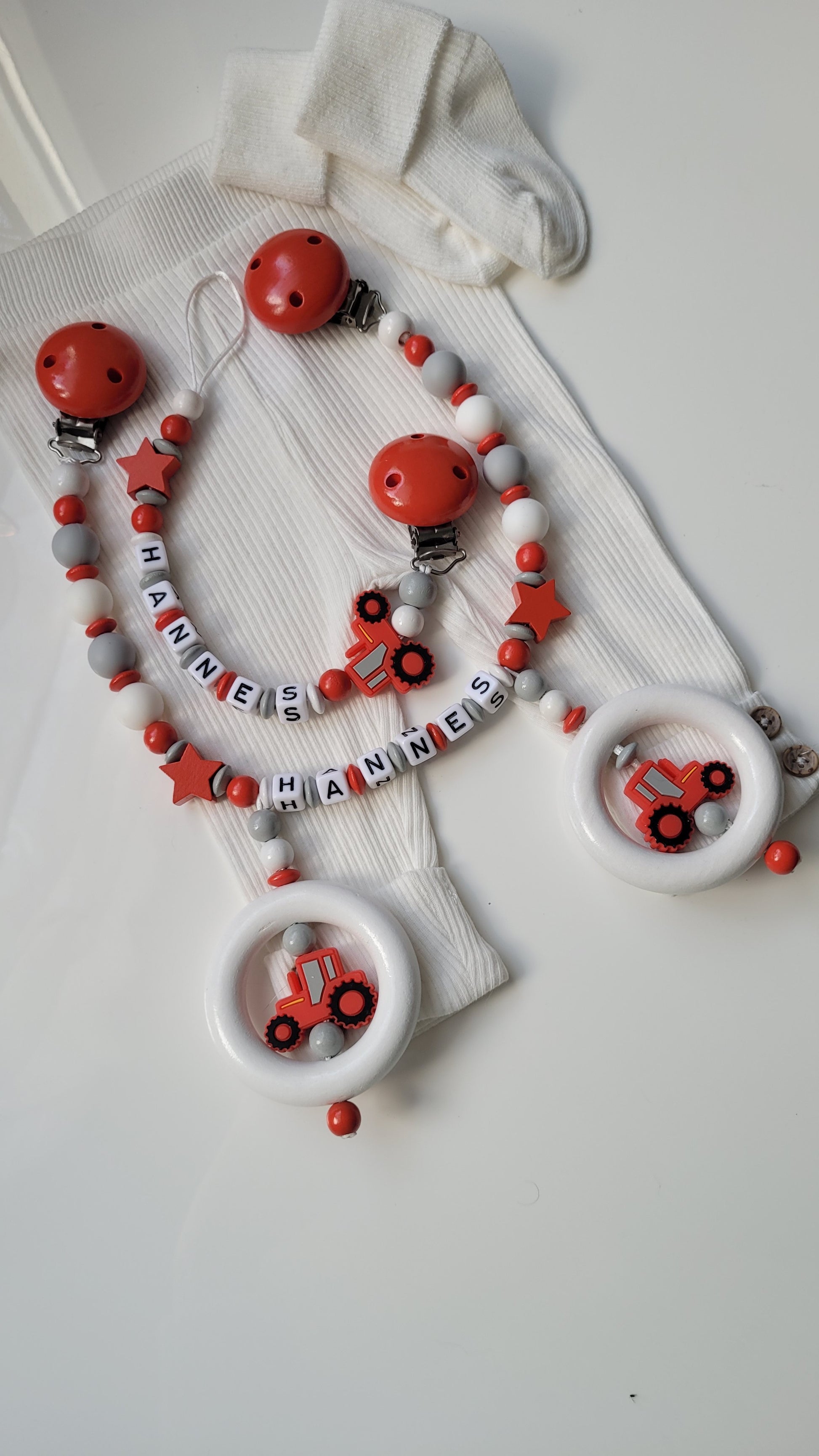 Set aus Schnullerkette und Kinderwagenkette rot grau mit Traktor Motiv und 2 Spielringen