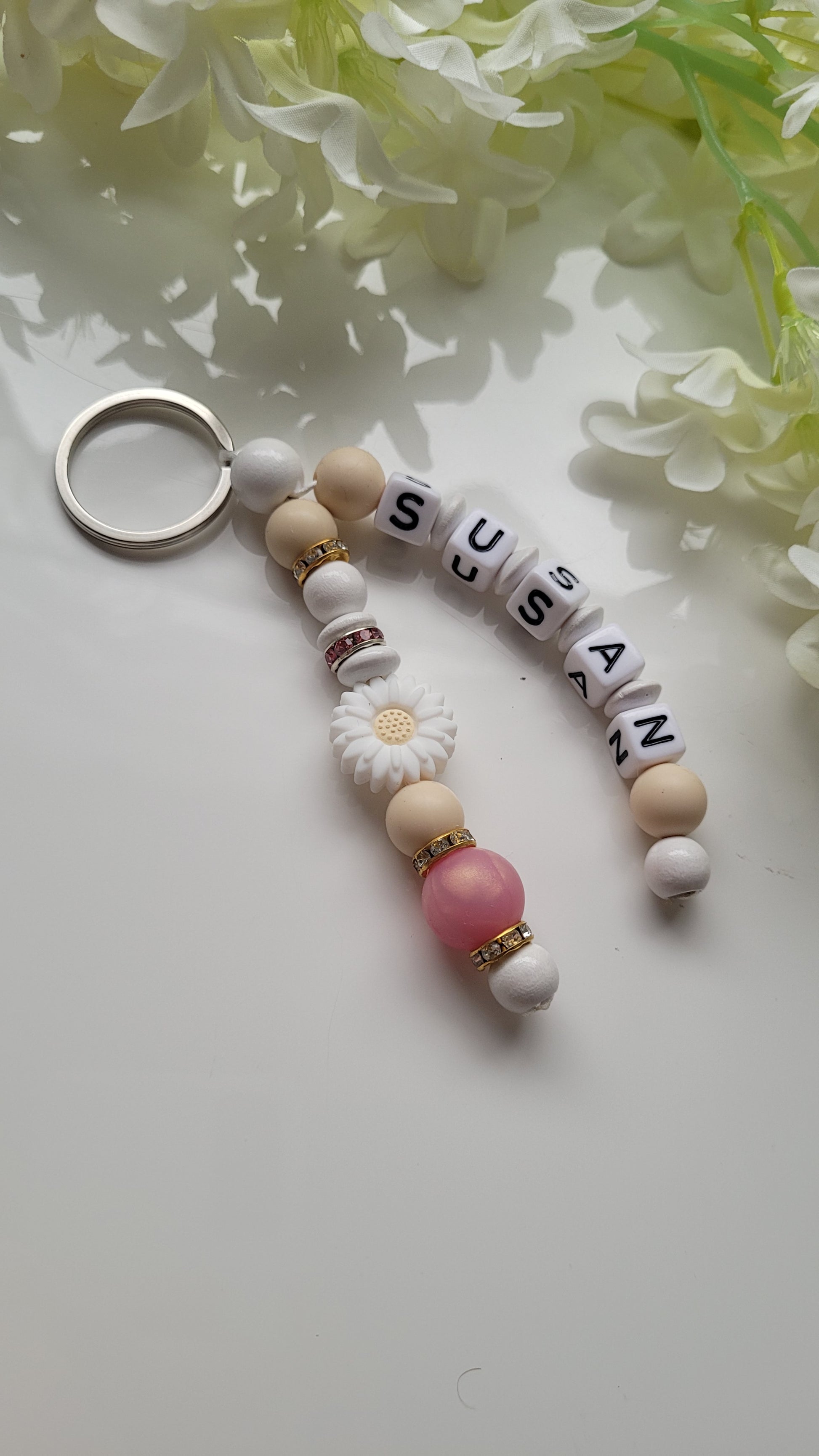 Schlüsselanhänger aus weissen rosegoldenen und beigen Silikonperlen , Holzperlen und Strassperlen