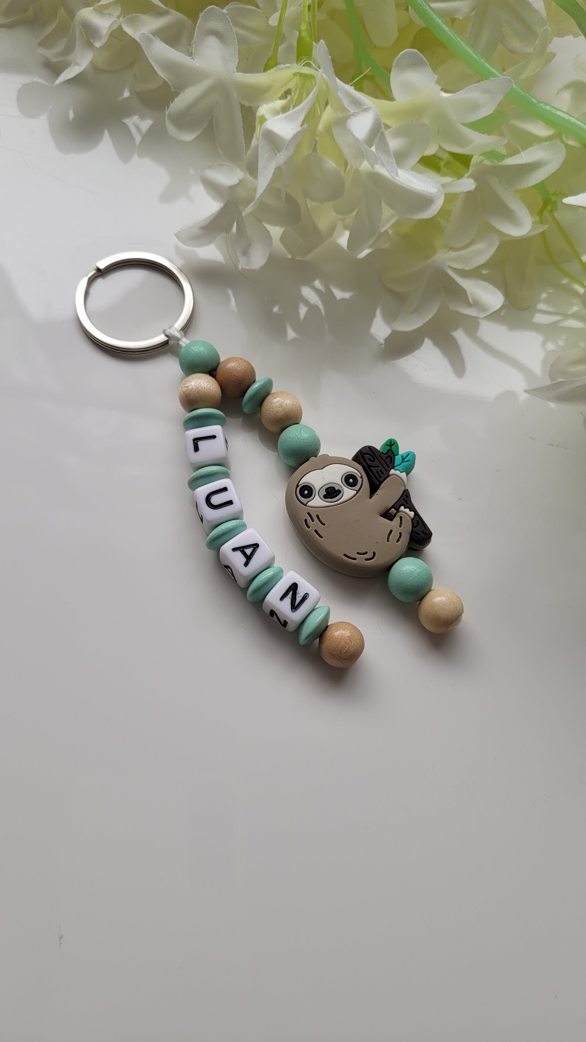 Schlüsselanhänger aus mintfarbenen Holzperlen.