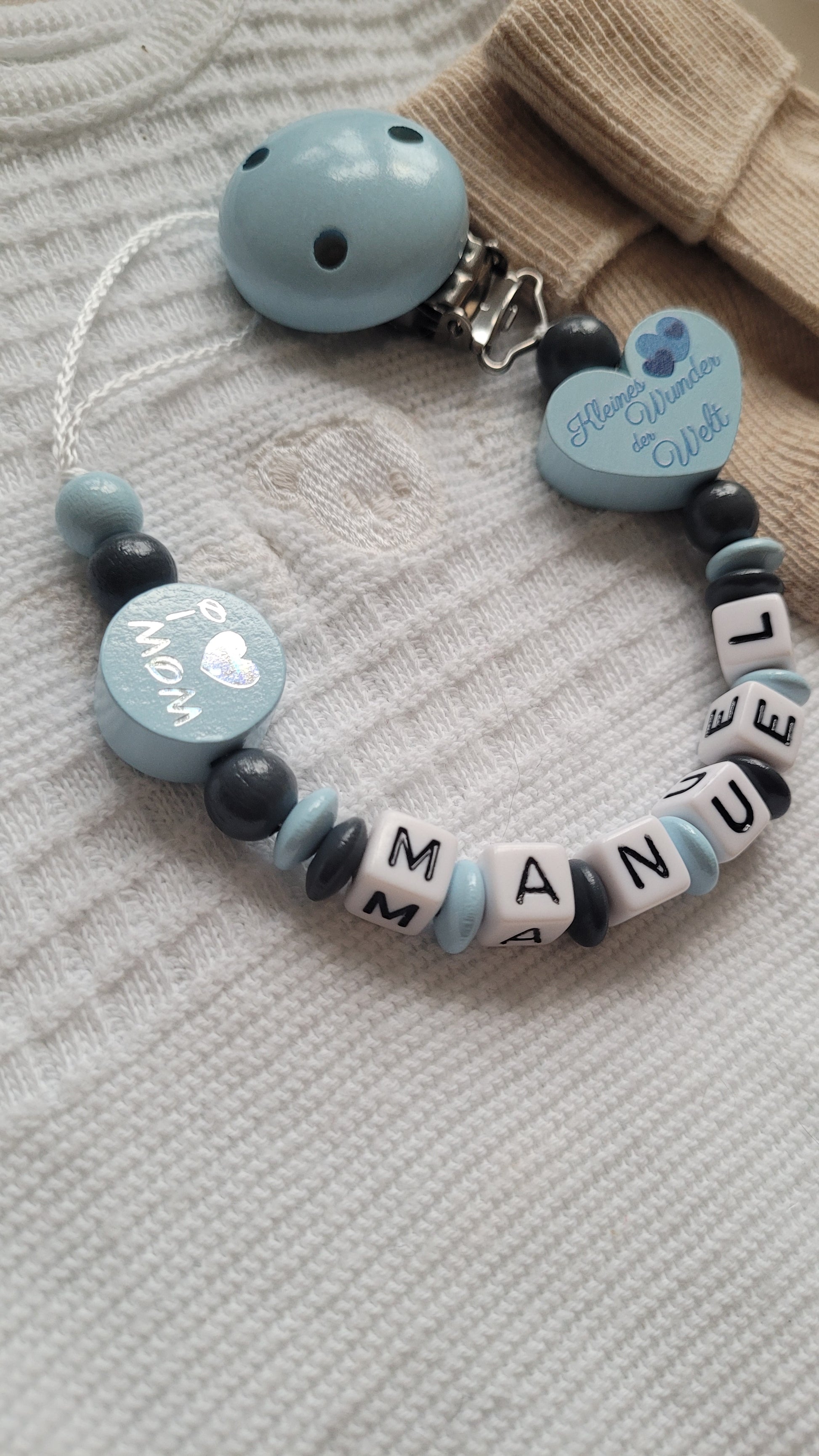 Schnullerkette für Jungen mit Namen i Love Mom & Dad / Kleines Wunder der Welt