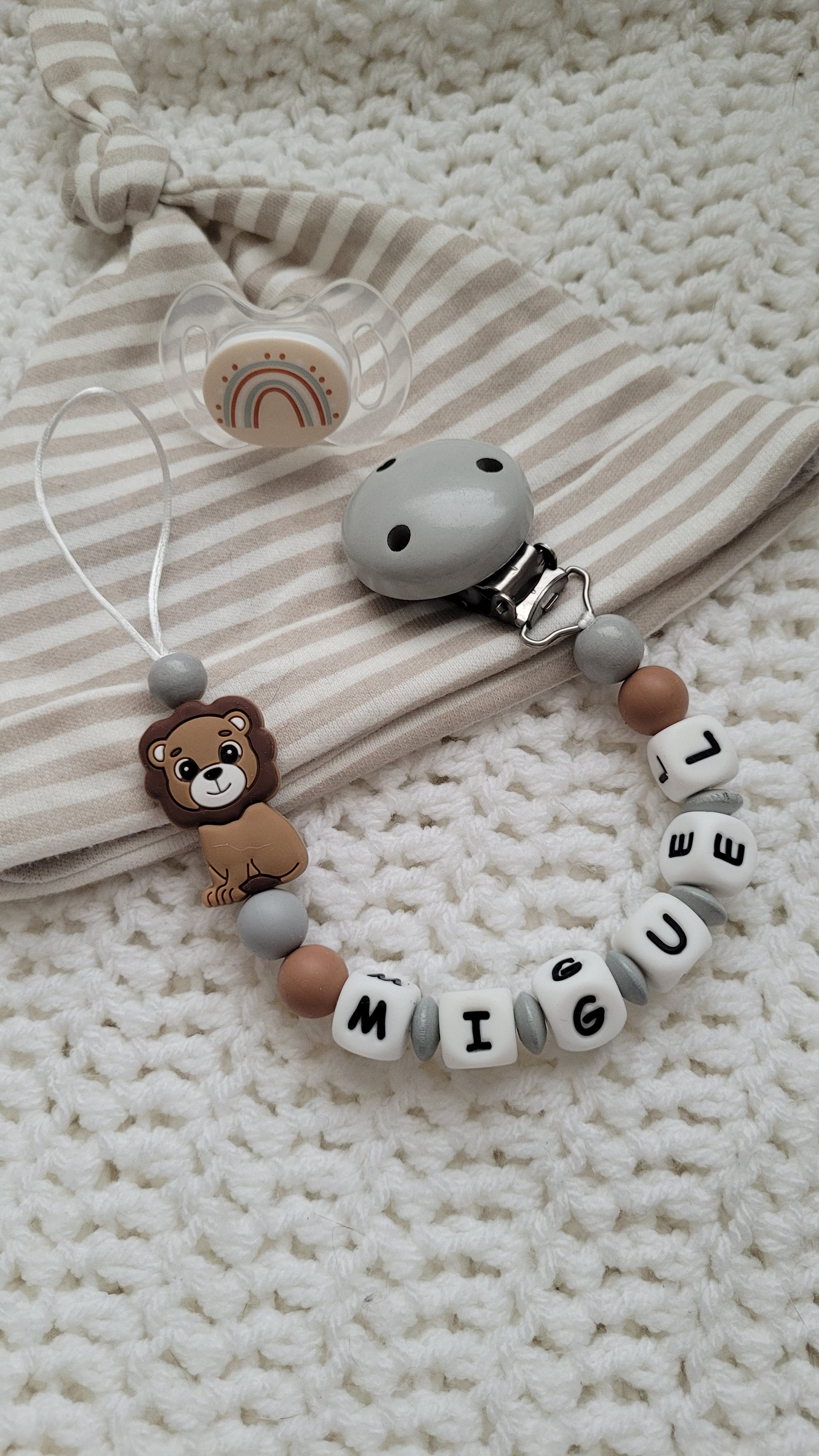 Schnullerkette Löwe Silikon mit Namen grau weiss