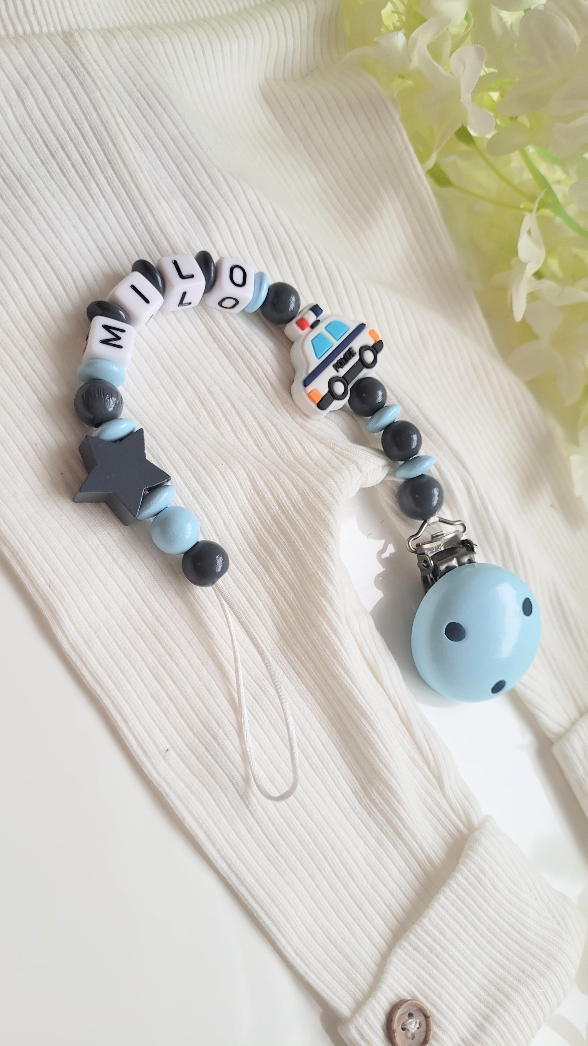 Schnullerkette mit Namen Polizeiauto grau hellblau