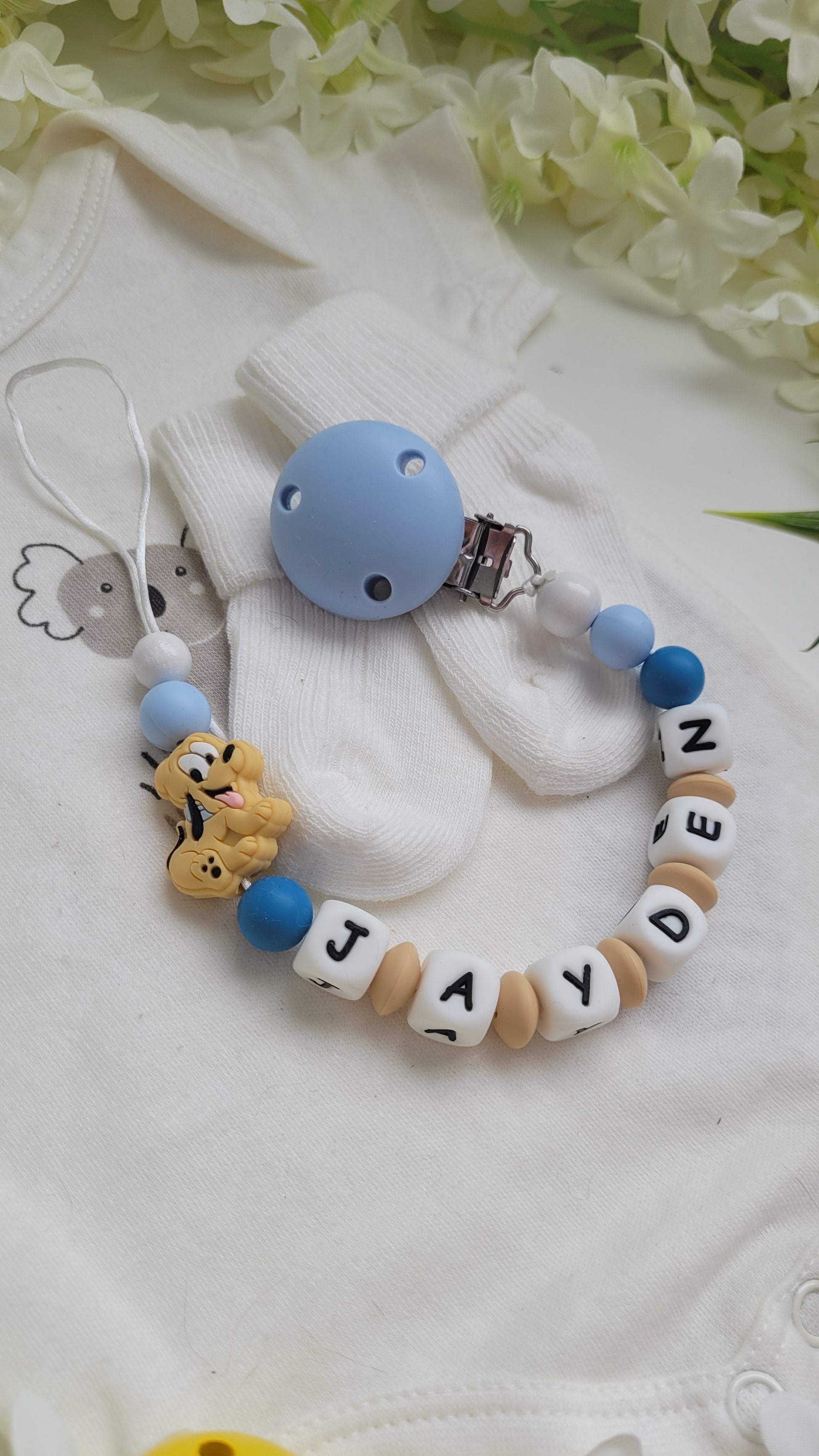 Schnullerkette mit Namen für Jungen Hund Babyblau beige