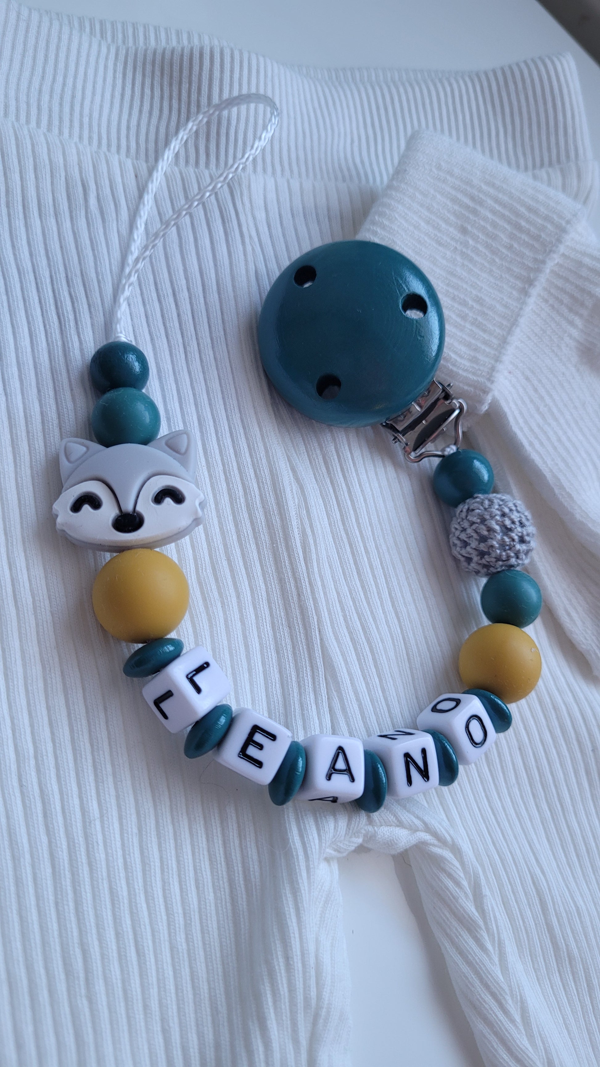 Schnullerkette mit Namen für Jungen Fuchs petrol