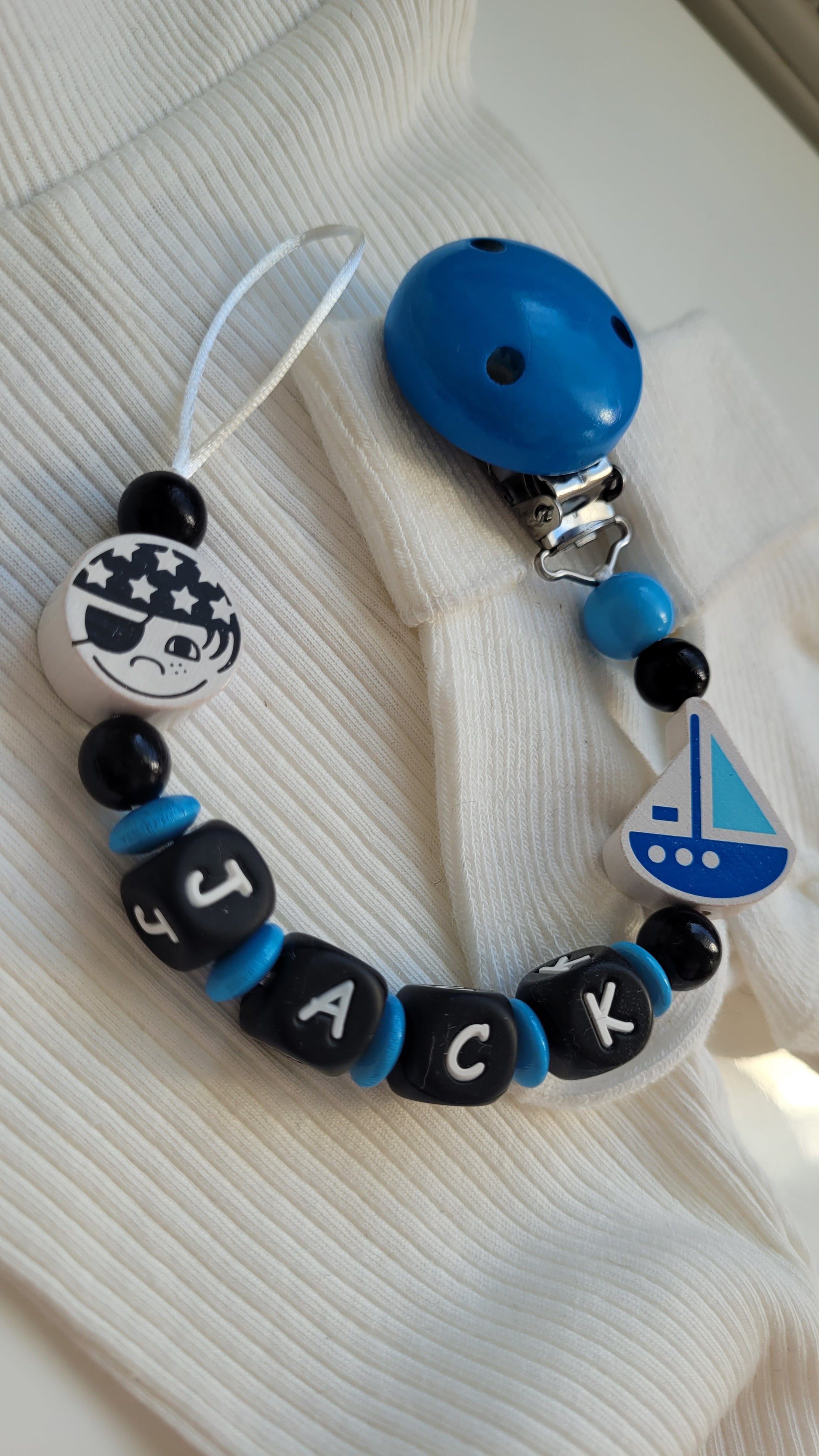 Zauberhafte Schnullerkette kleiner Pirat Holzperlen mit Pirat Motiv und Boot