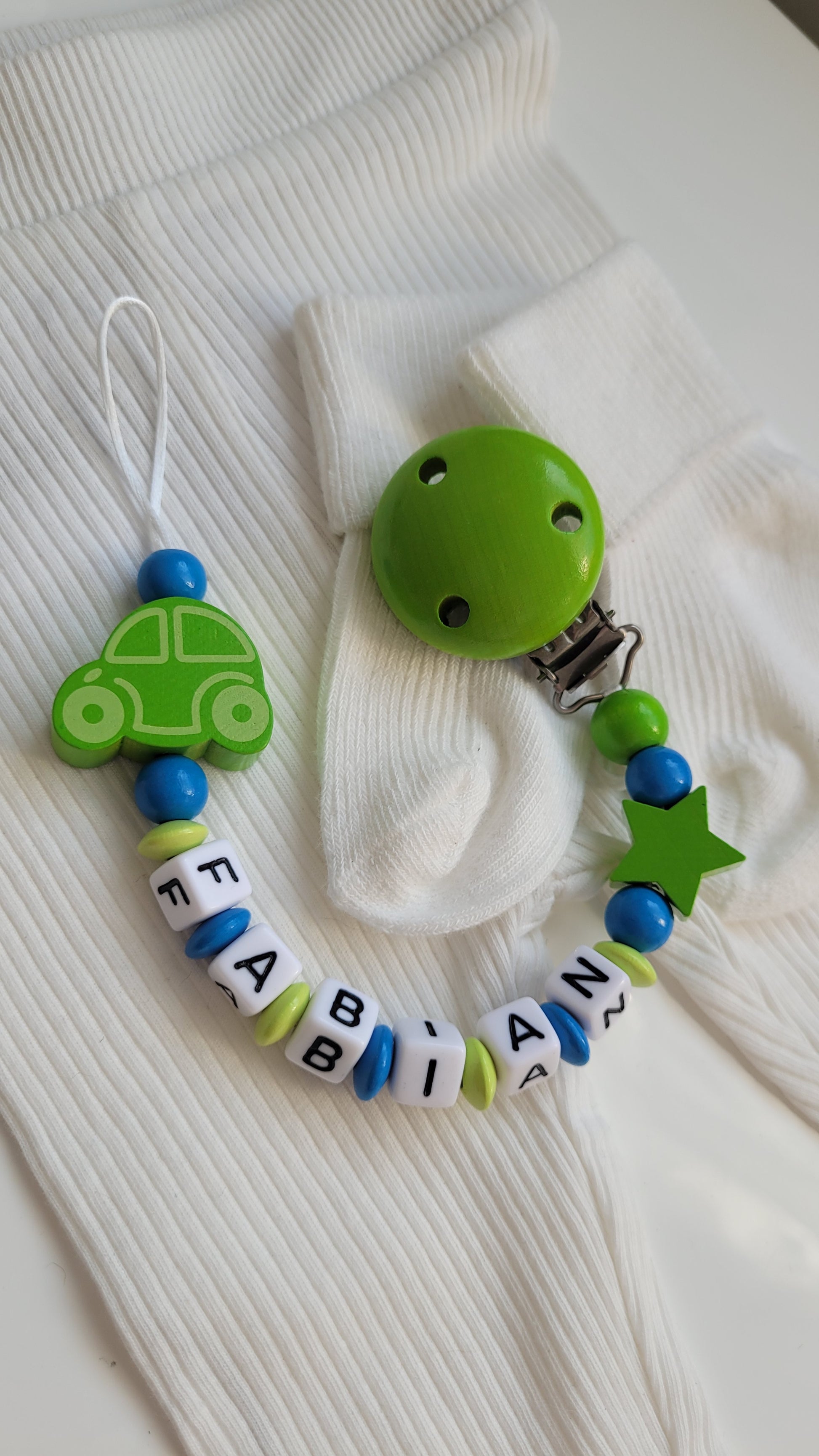 Zauberhafte Schnullerkette Auto aus Holzperlen mit Automotiv und Stern
