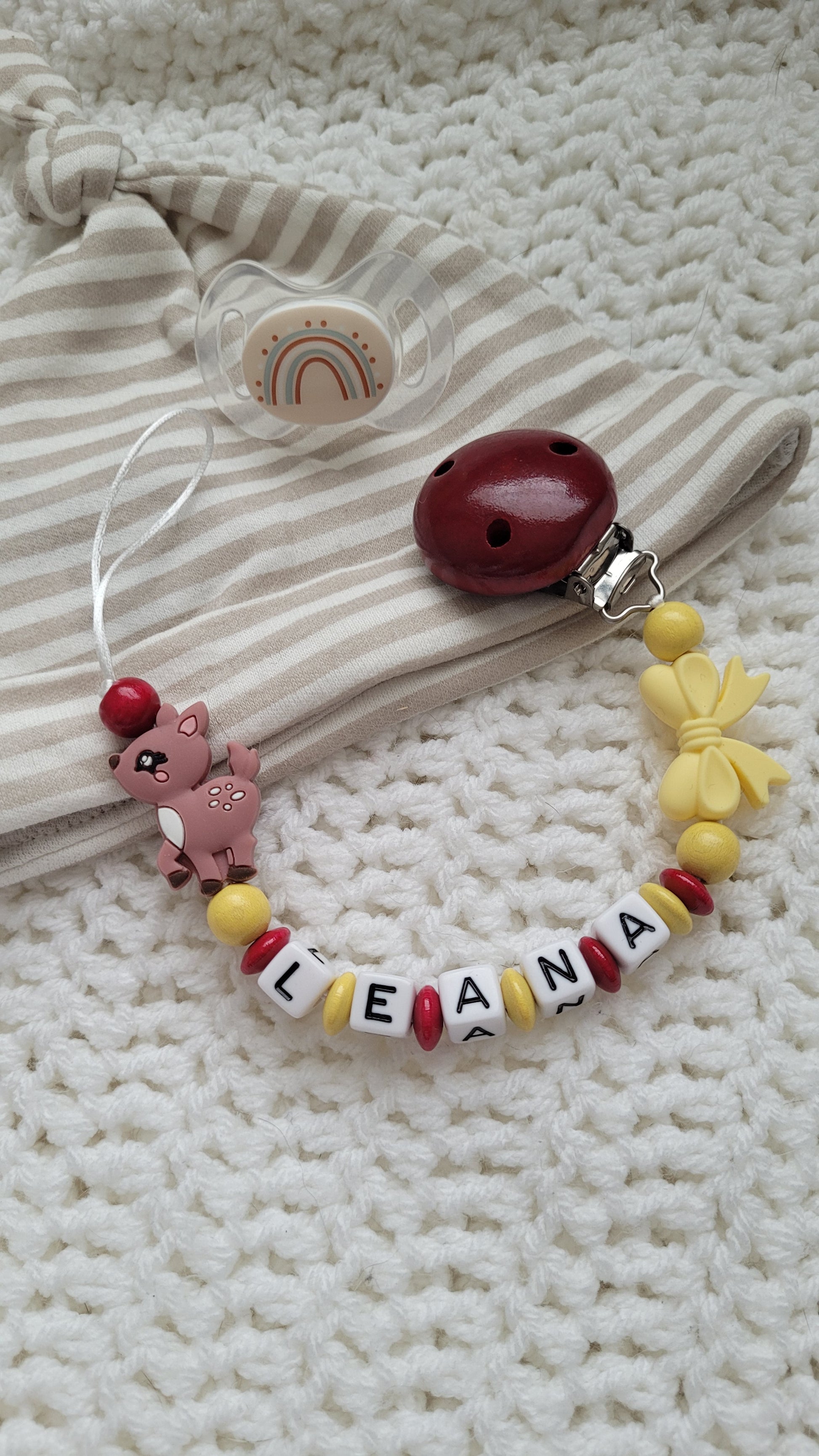 Schnullerkette mit Namen für Mädchen Reh bordaux gelb