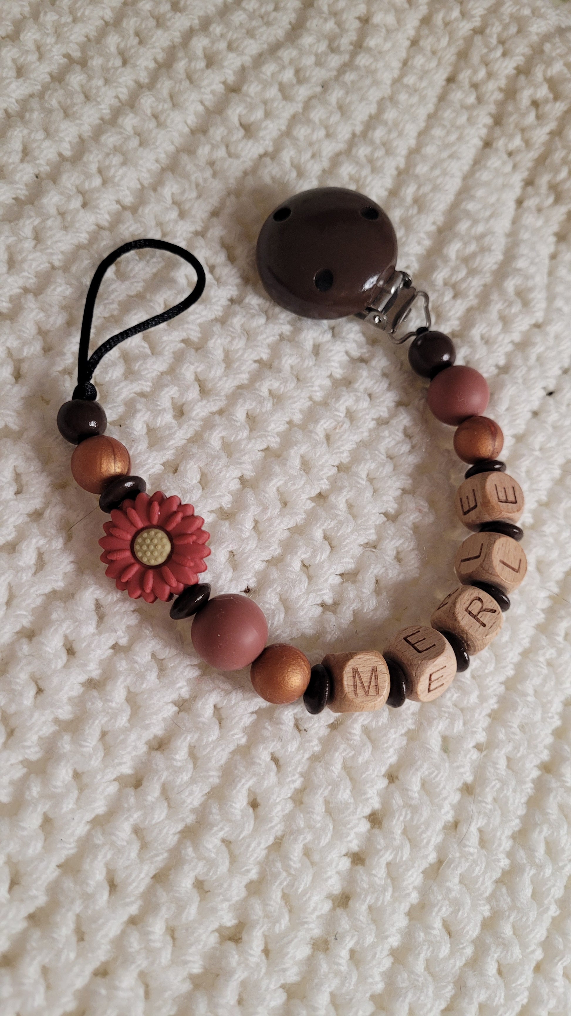 Zauberhafte Schnullerkette Blümchen aus braunen, kupferfarbenen Silikonperlen und Holzperlen