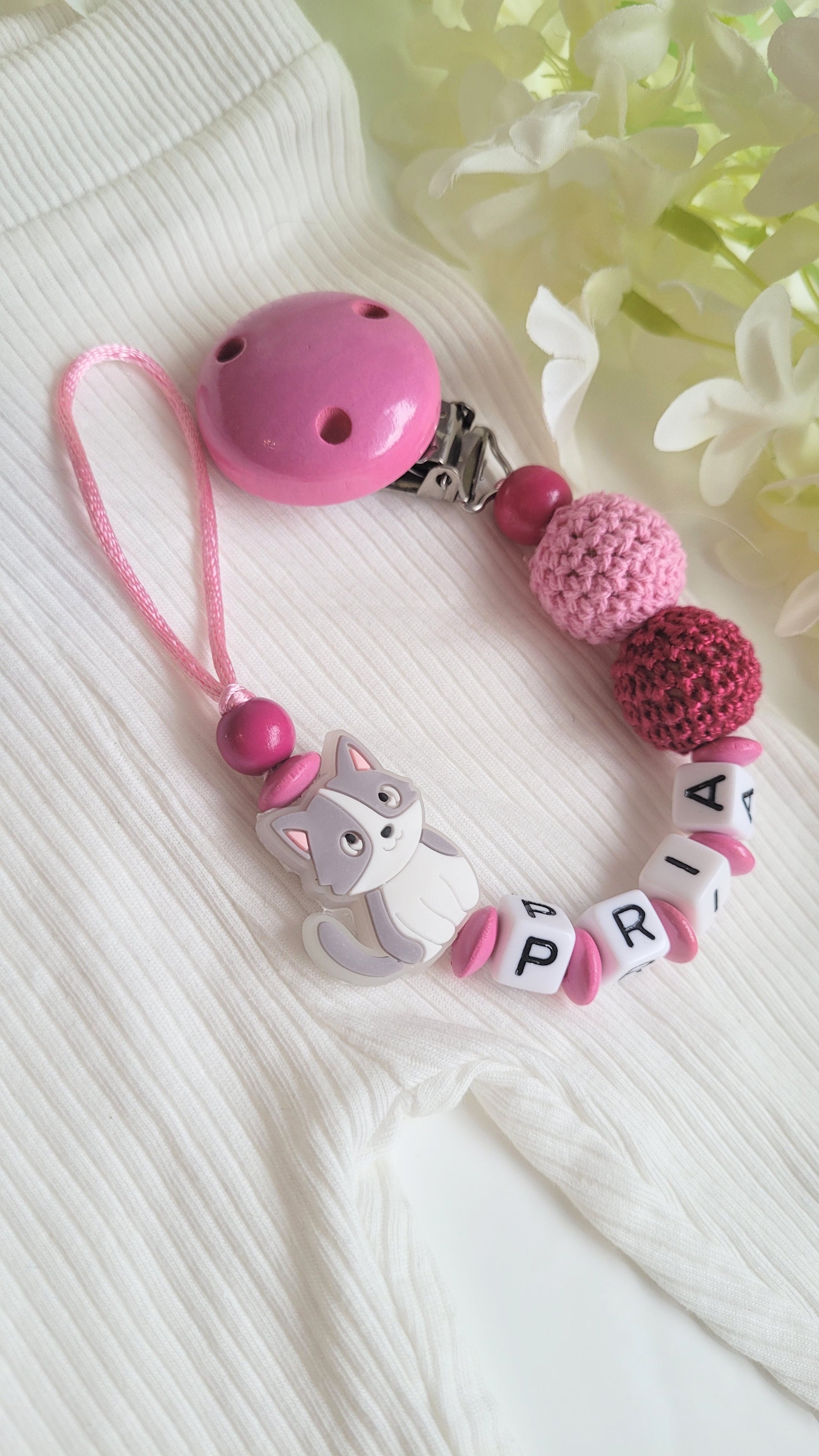 Schnullerkette mit Namen für Mädchen Kätzchen nachtleuchtend