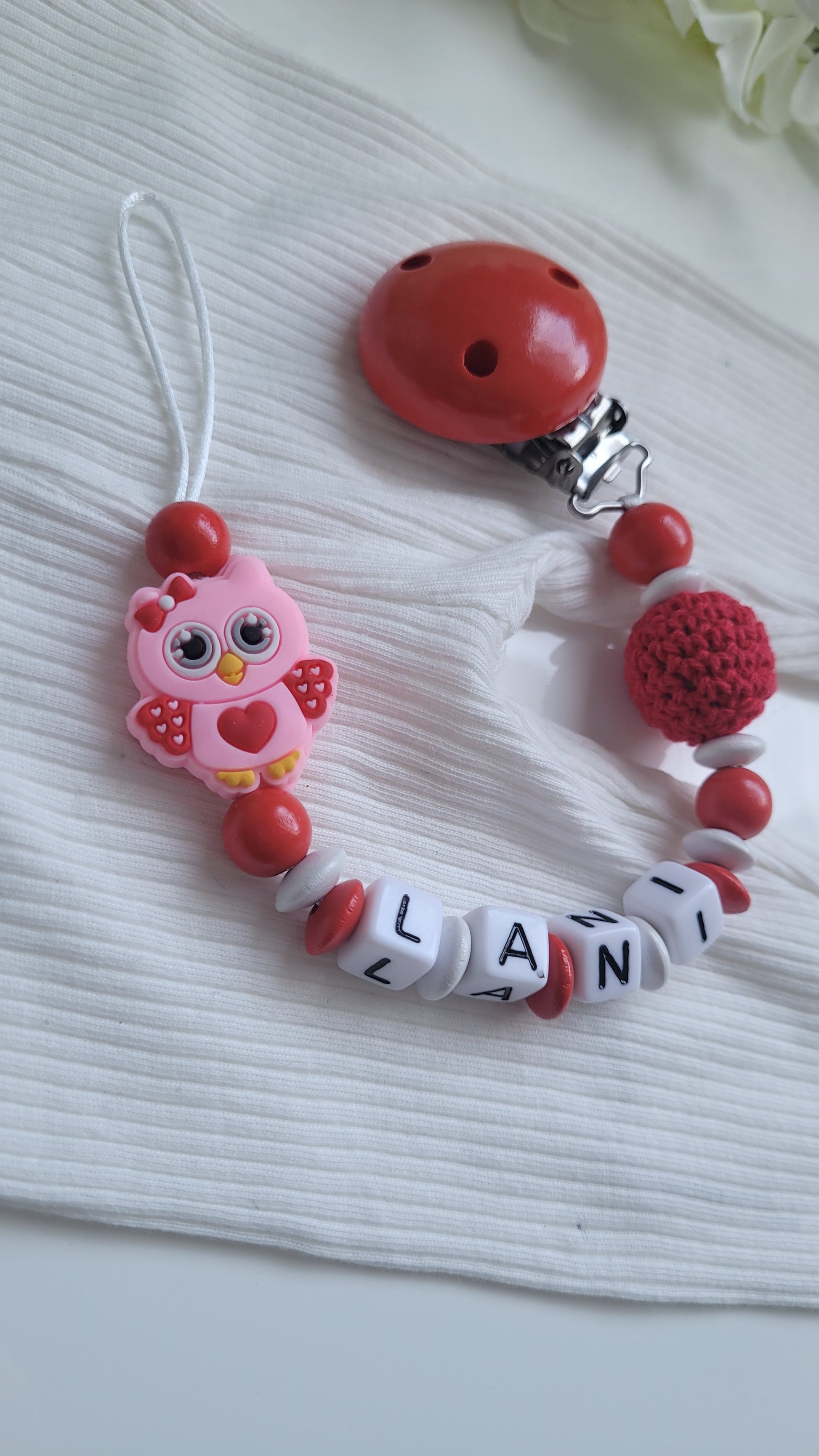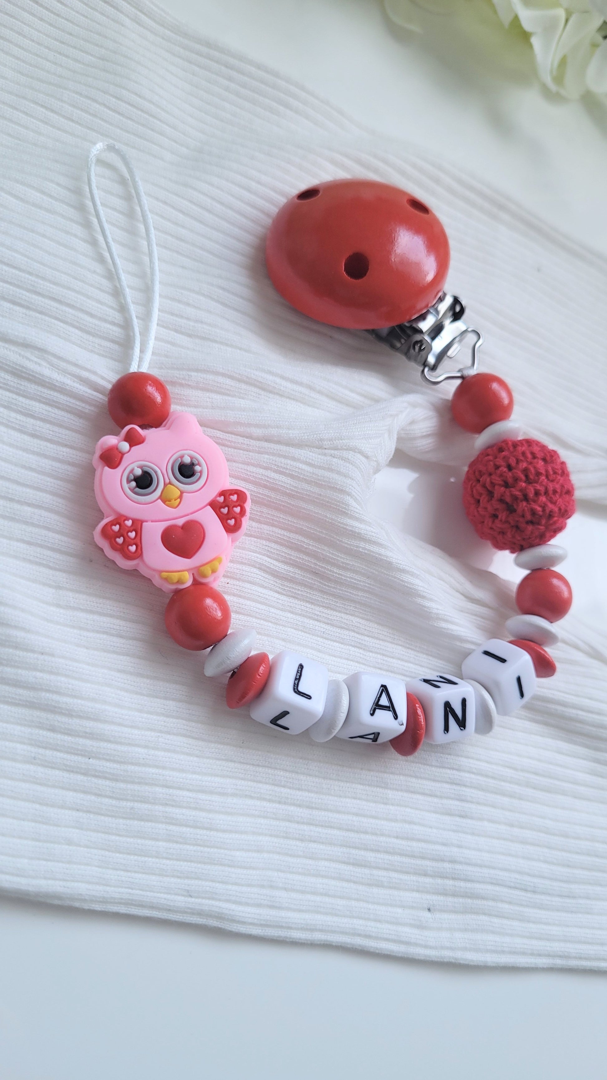 Schnullerkette in Rot weiß mit der niedlichen Eule gefertigt. Sie wird in roten und weißen Holzperlen sowie einer roten Häkelperle gefertigt