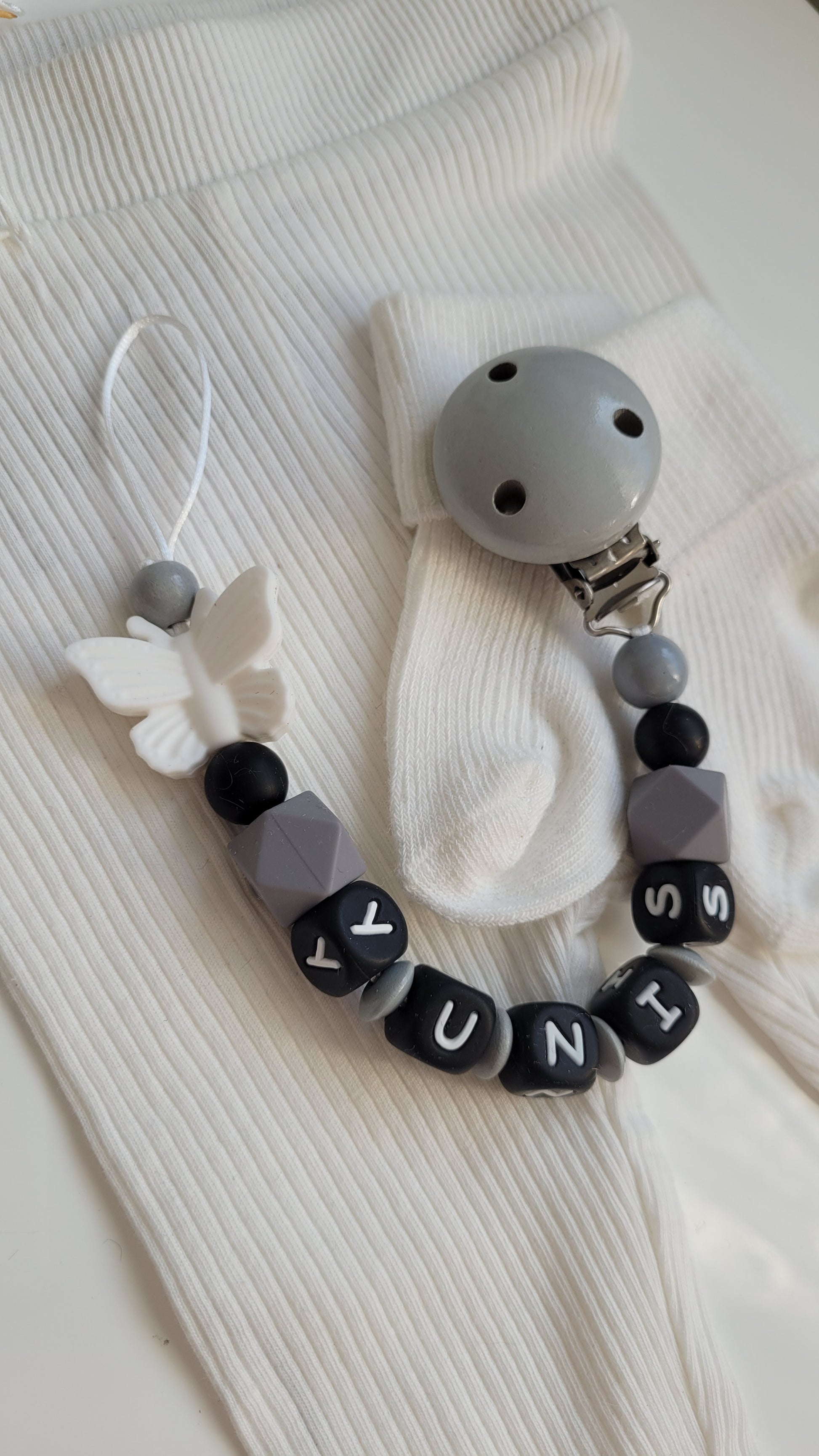 Schnullerkette mit Namen für Mädchen Schmetterling grau