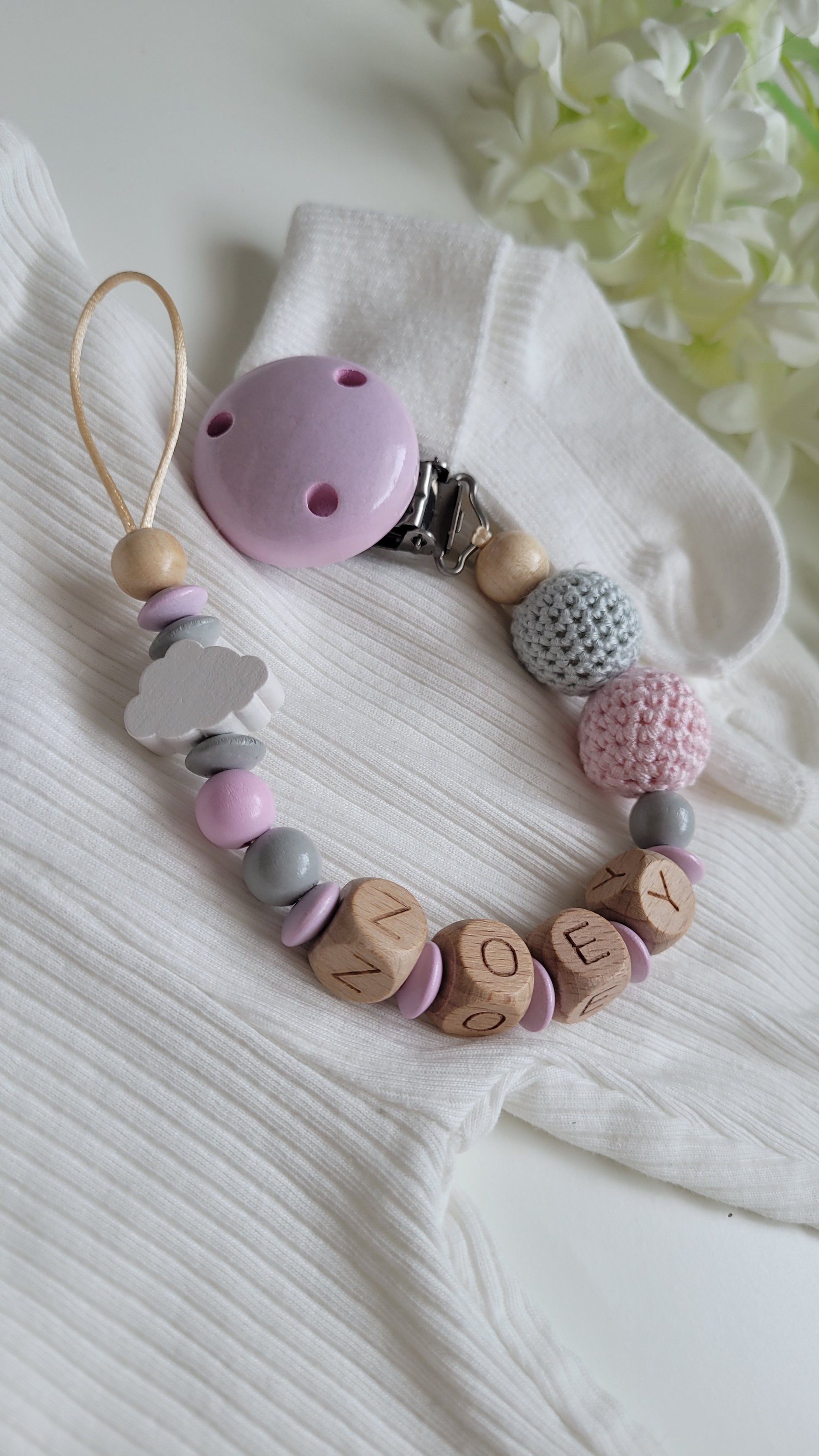 Die Schnullerkette wurde aus Holz gefertigt mit einer Wolke und den tollen rosa und grauen Häkelperlen