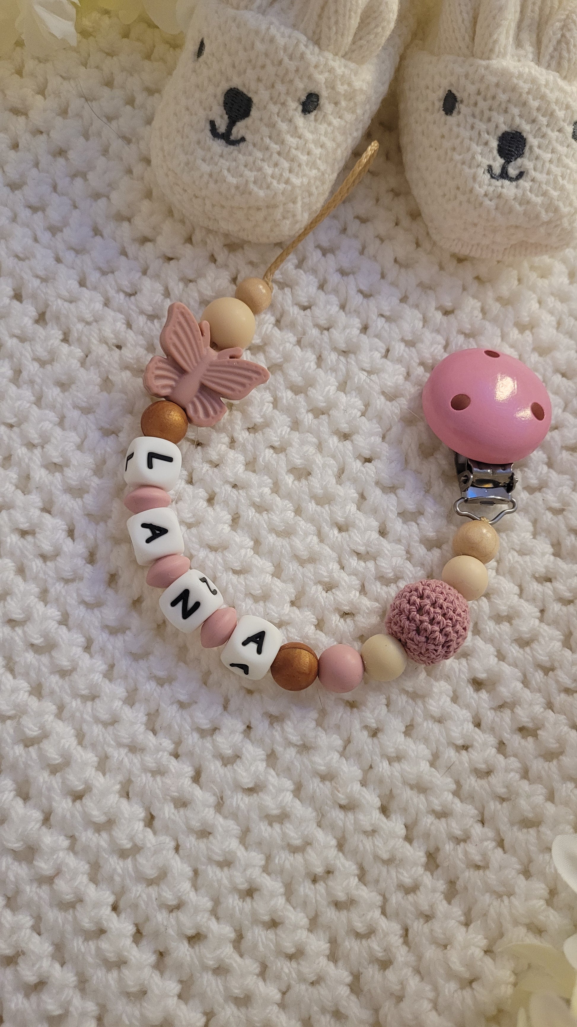 Schnullerkette mit Namen für Mädchen Schmetterling Beige rose