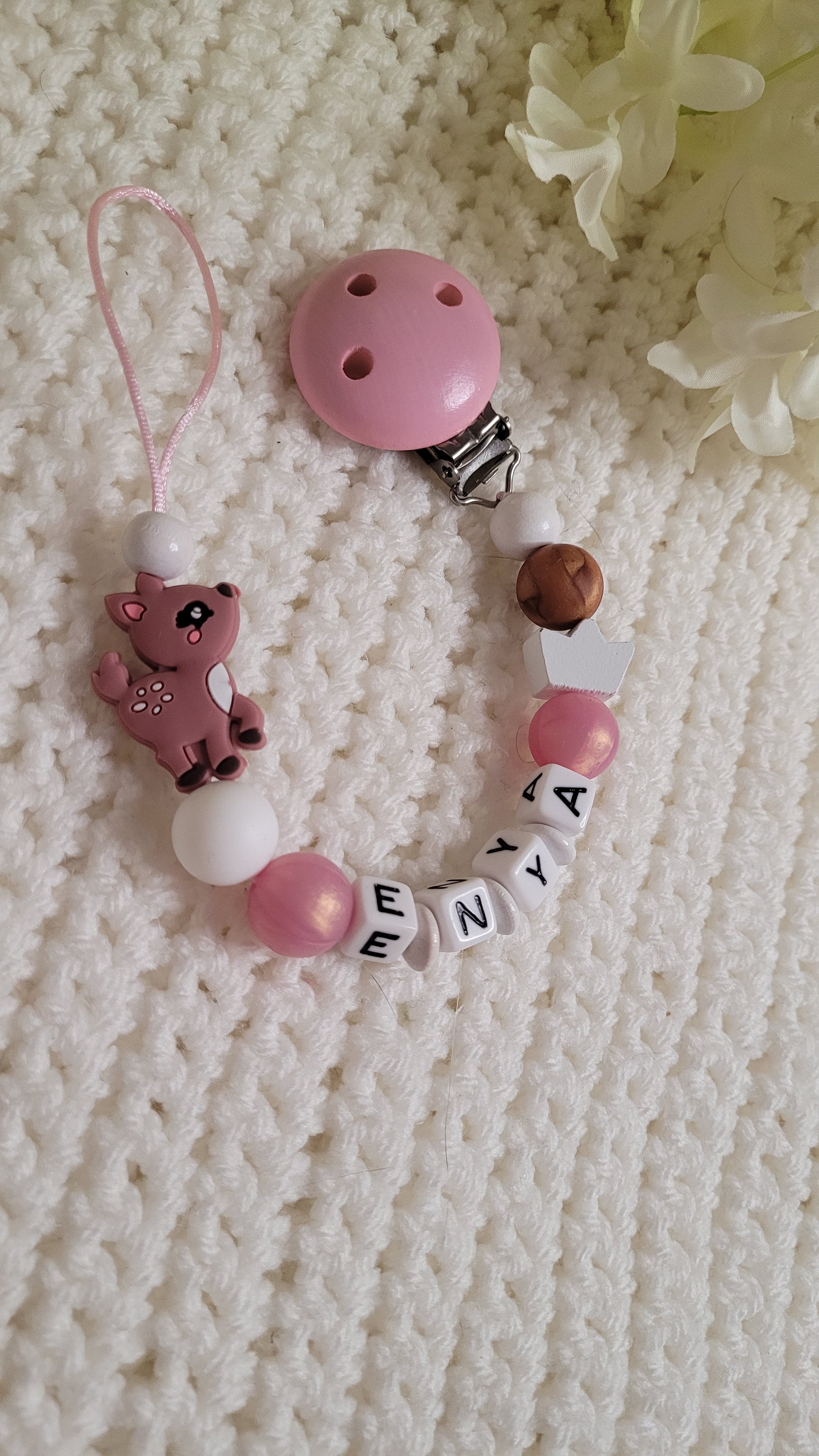 Schnullerkette mit Namen für Mädchen Reh rosa rosegold