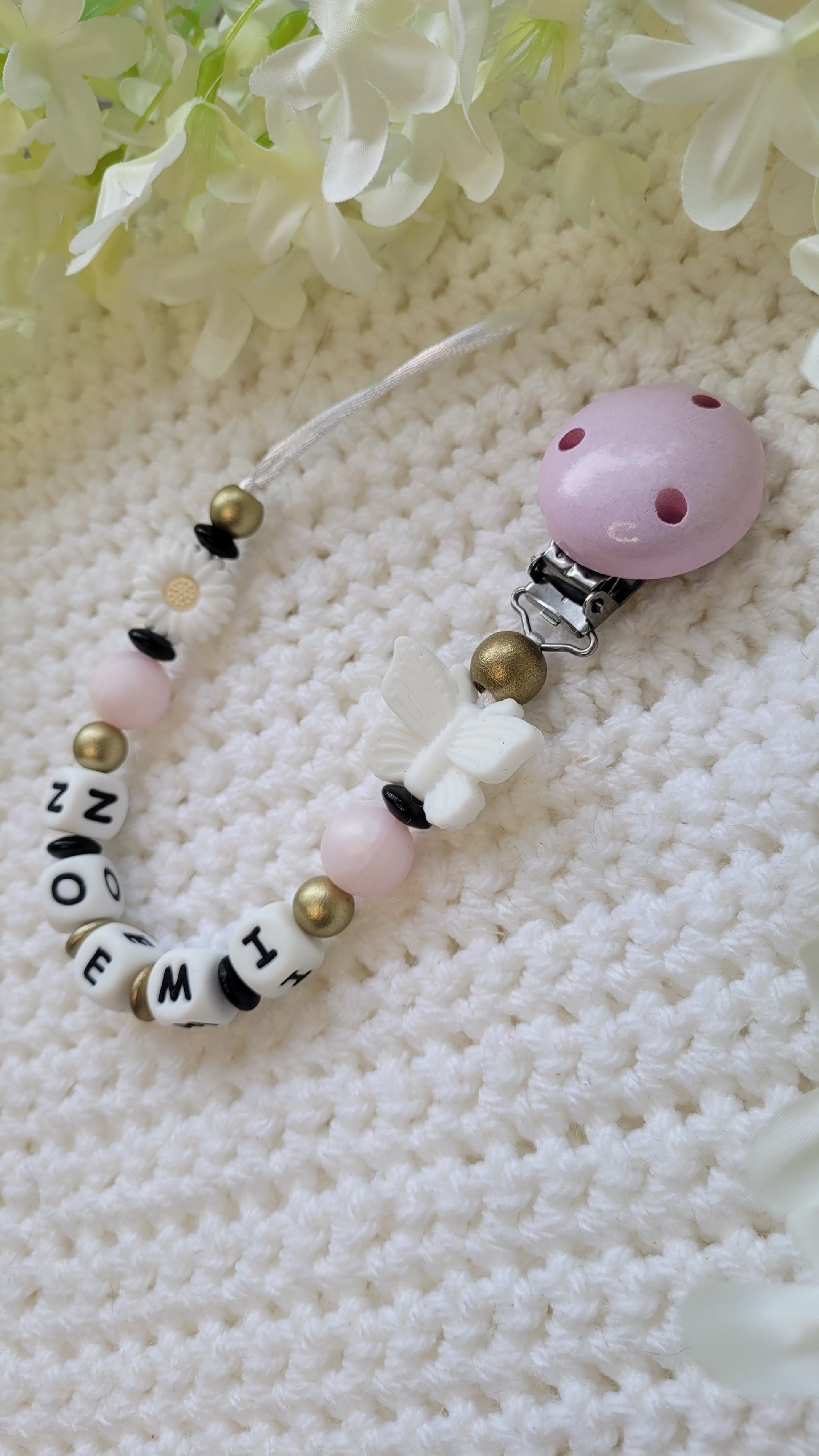 Wir fertigen deine persönliche Schnullerkette mit Wunschnamen in liebevoller Handarbeit