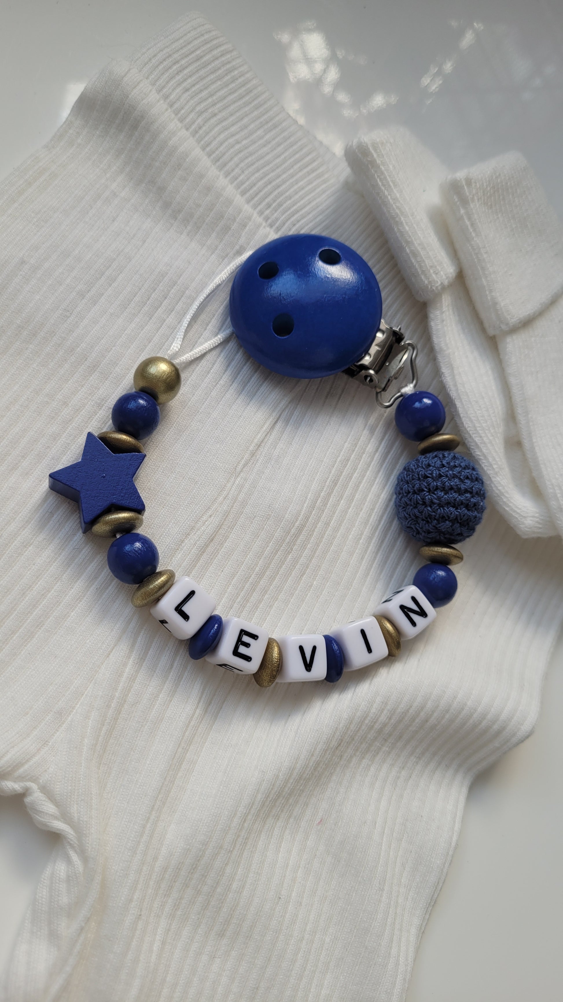 Zauberhafte Schnullerkette Sternchen in Holz in den Farben blau gold