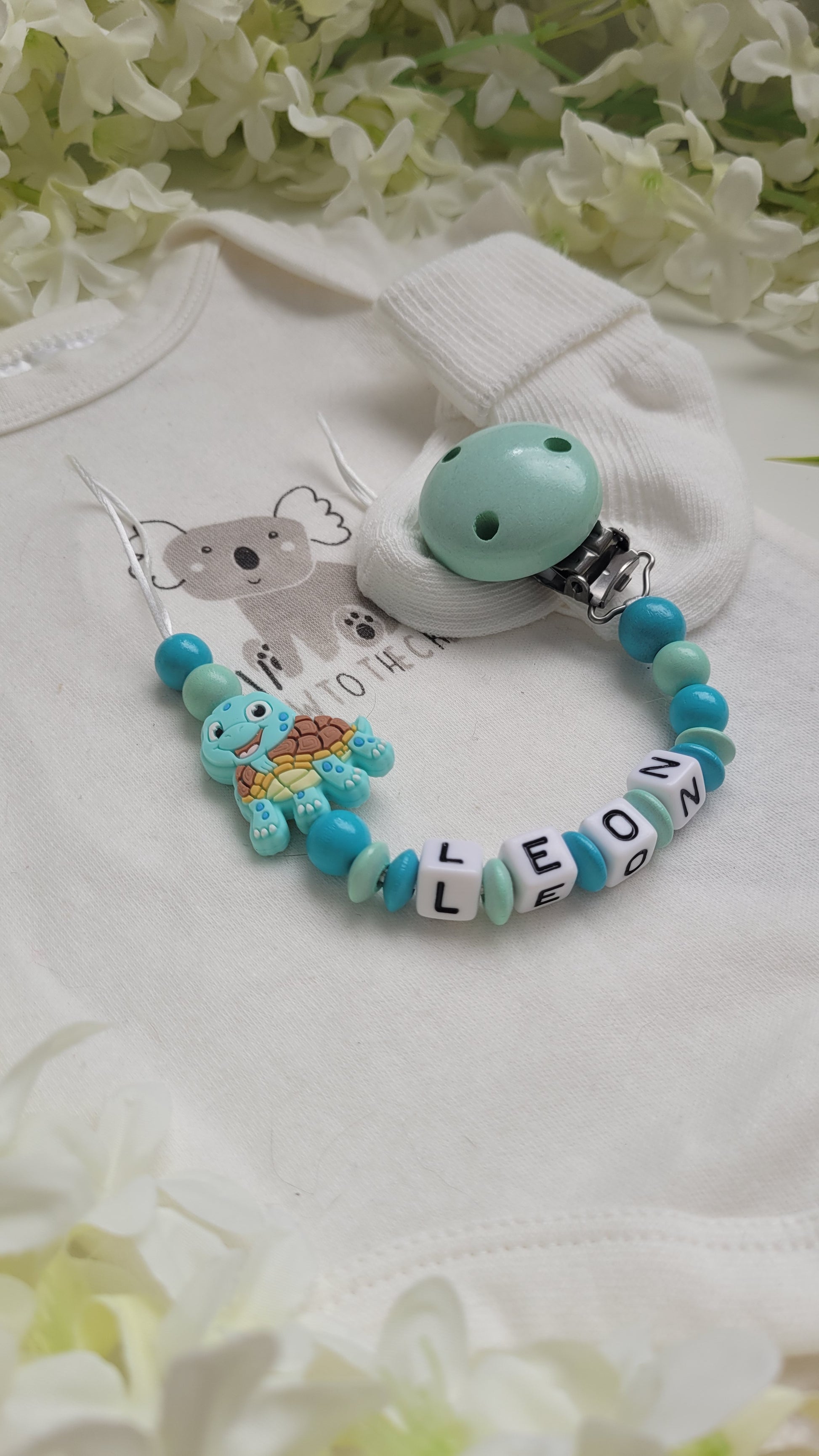 Niedliche Schnullerkette aus Holzperlen in mint türkis mit der süßen Schildkröte