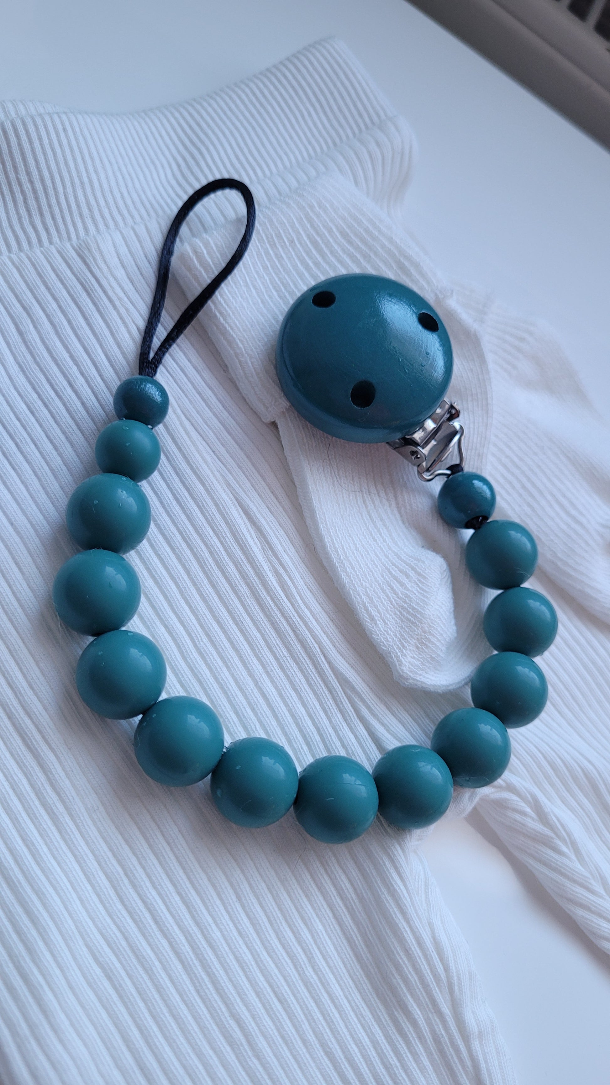 Schnullerkette aus petrolfarbenen Silikonperlen.