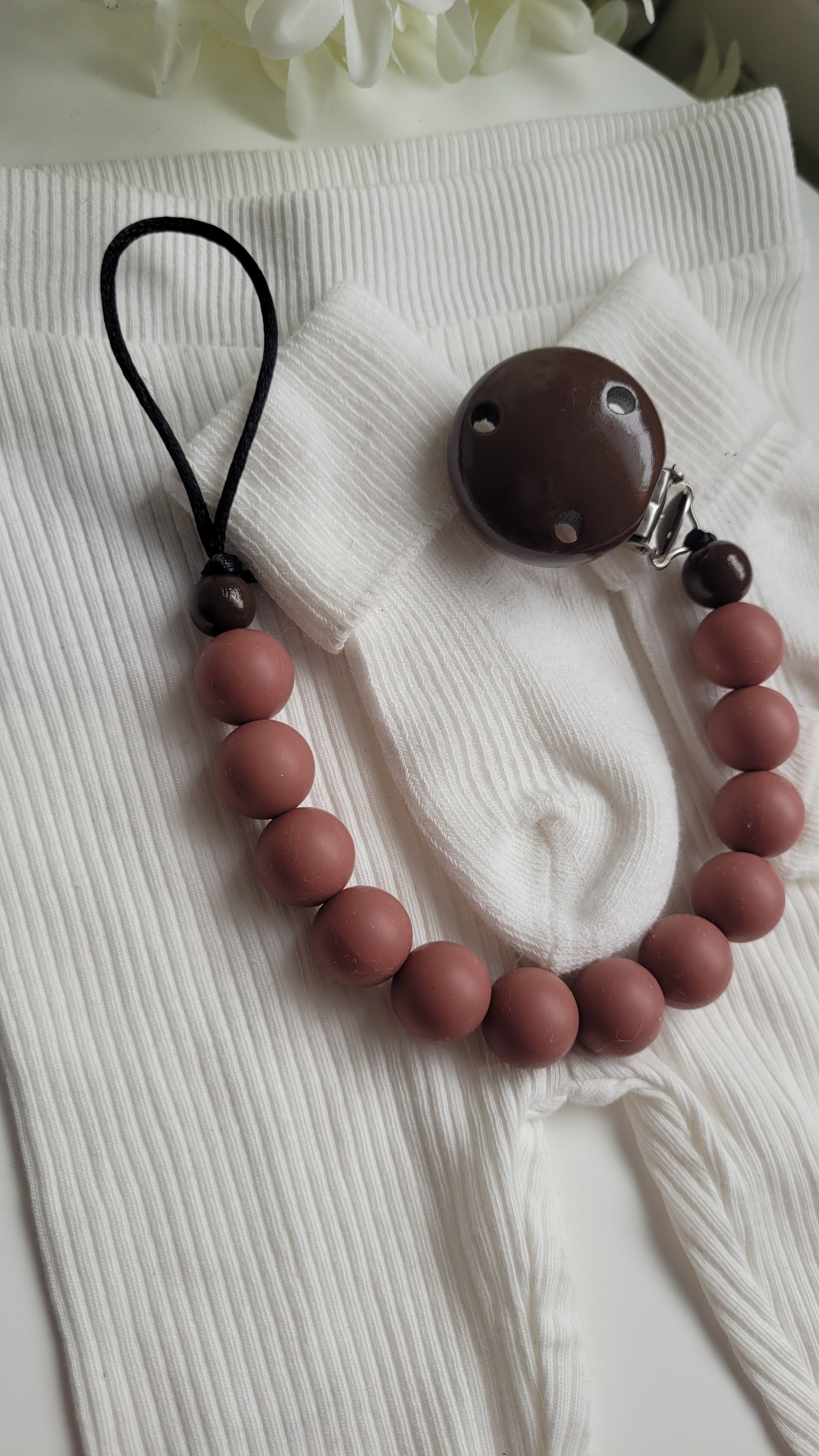 Schnullerkette aus rehbraunen Silikonperlen.