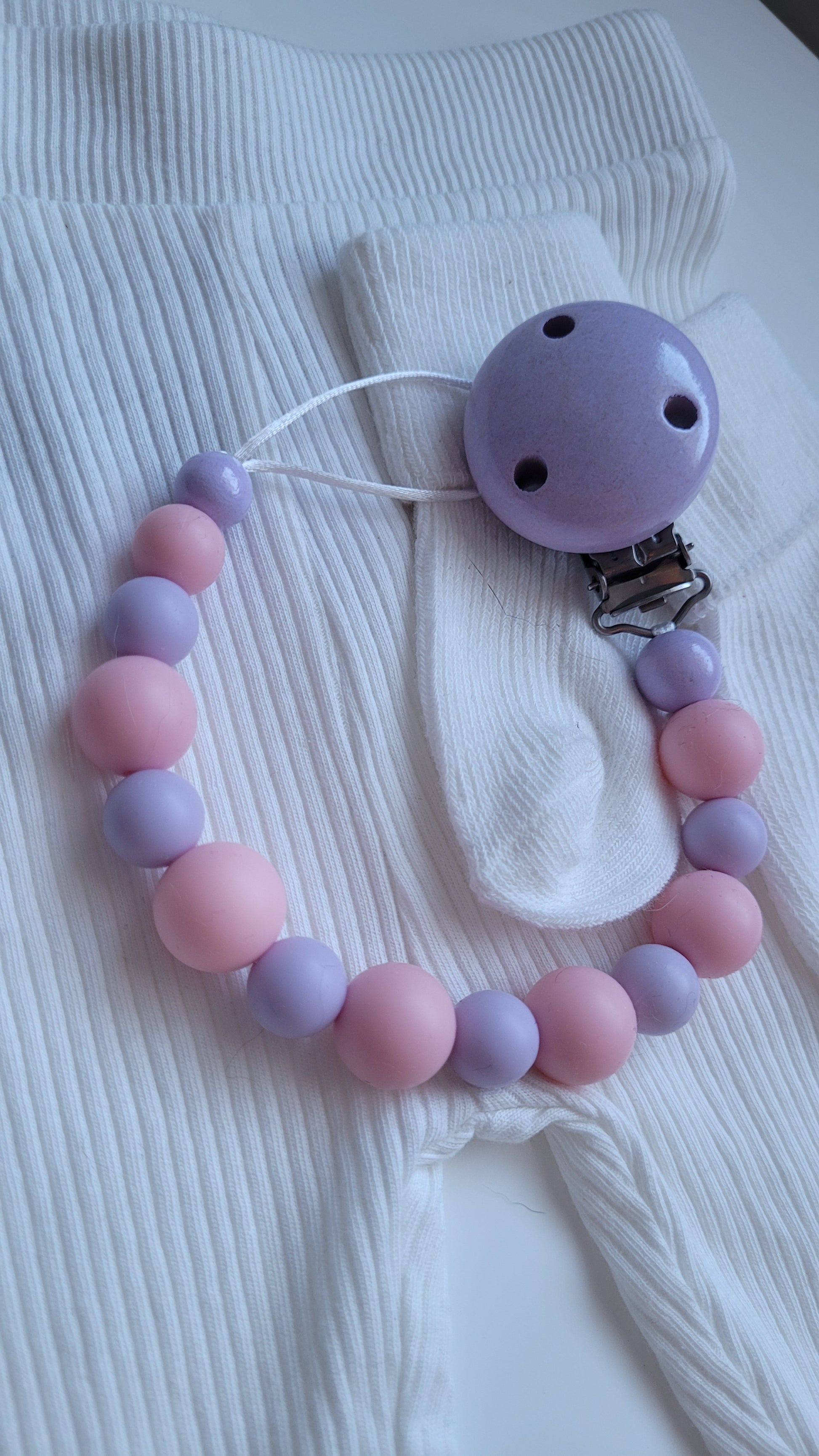 Schnullerkette aus flieder und peachfarbenen Silikonperlen.