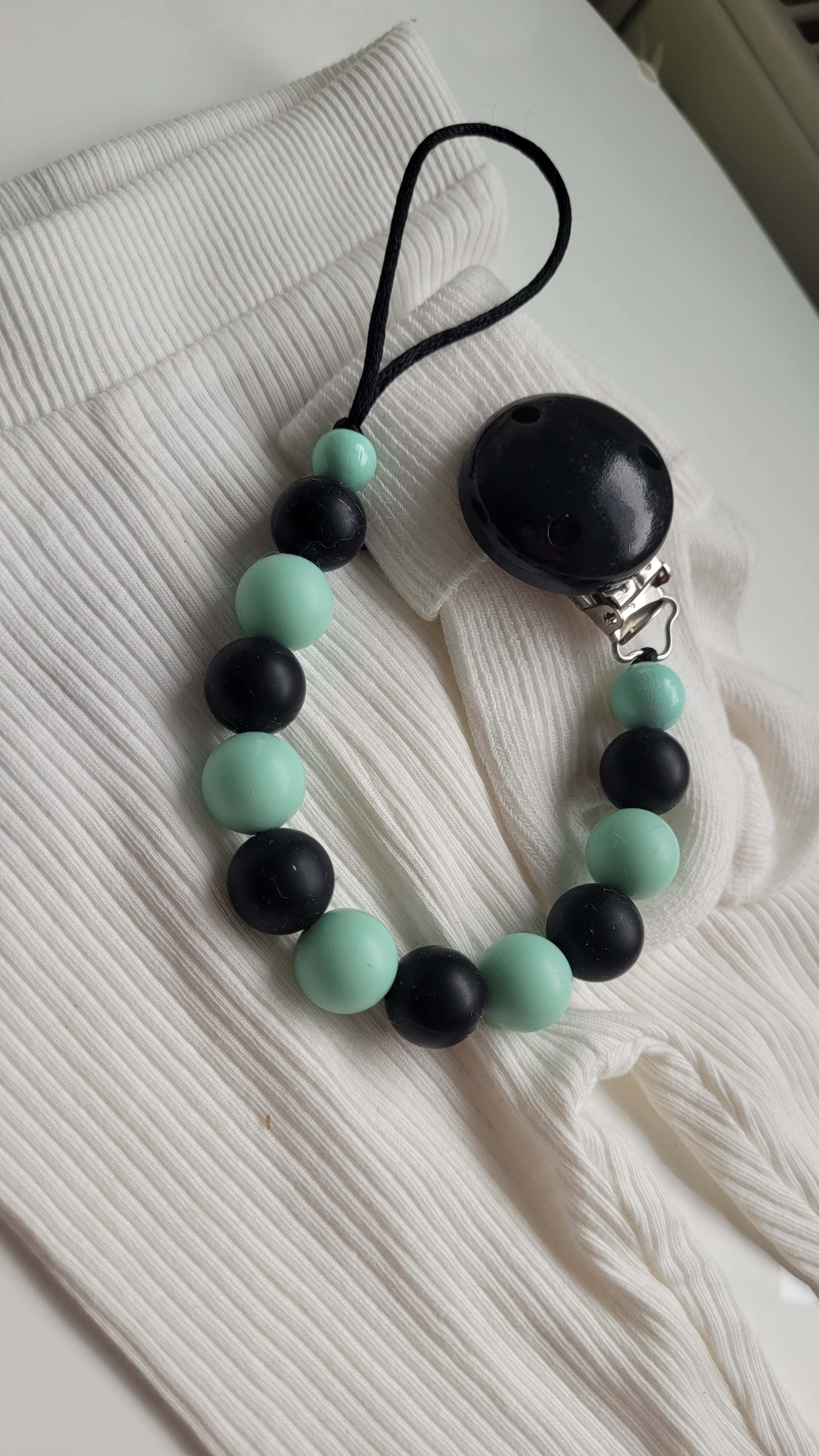 Schnullerkette aus mint und schwarzen Silikonperlen.