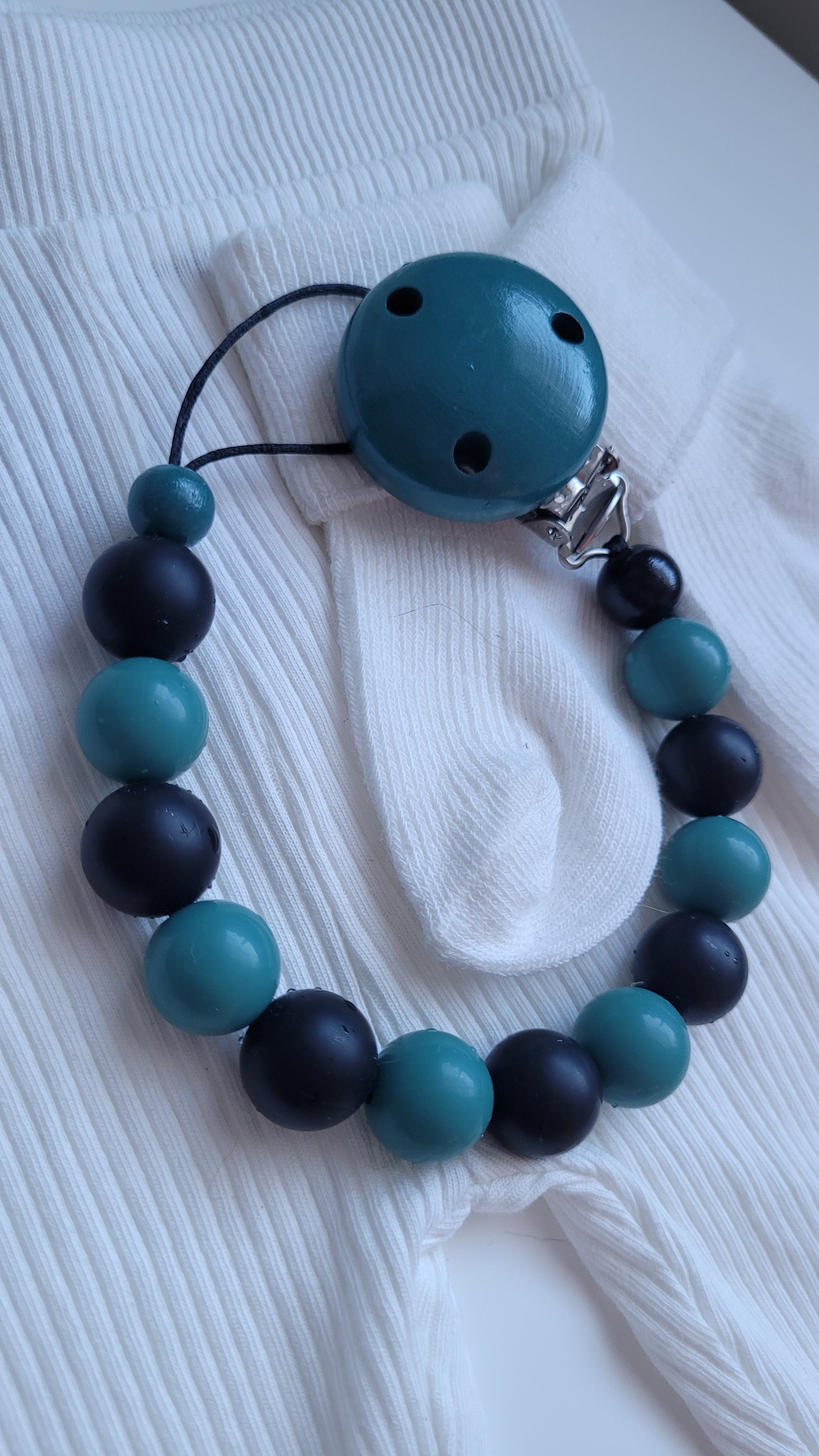 Schnullerkette aus schwarzen und petrolfarbenen Silikonperlen.