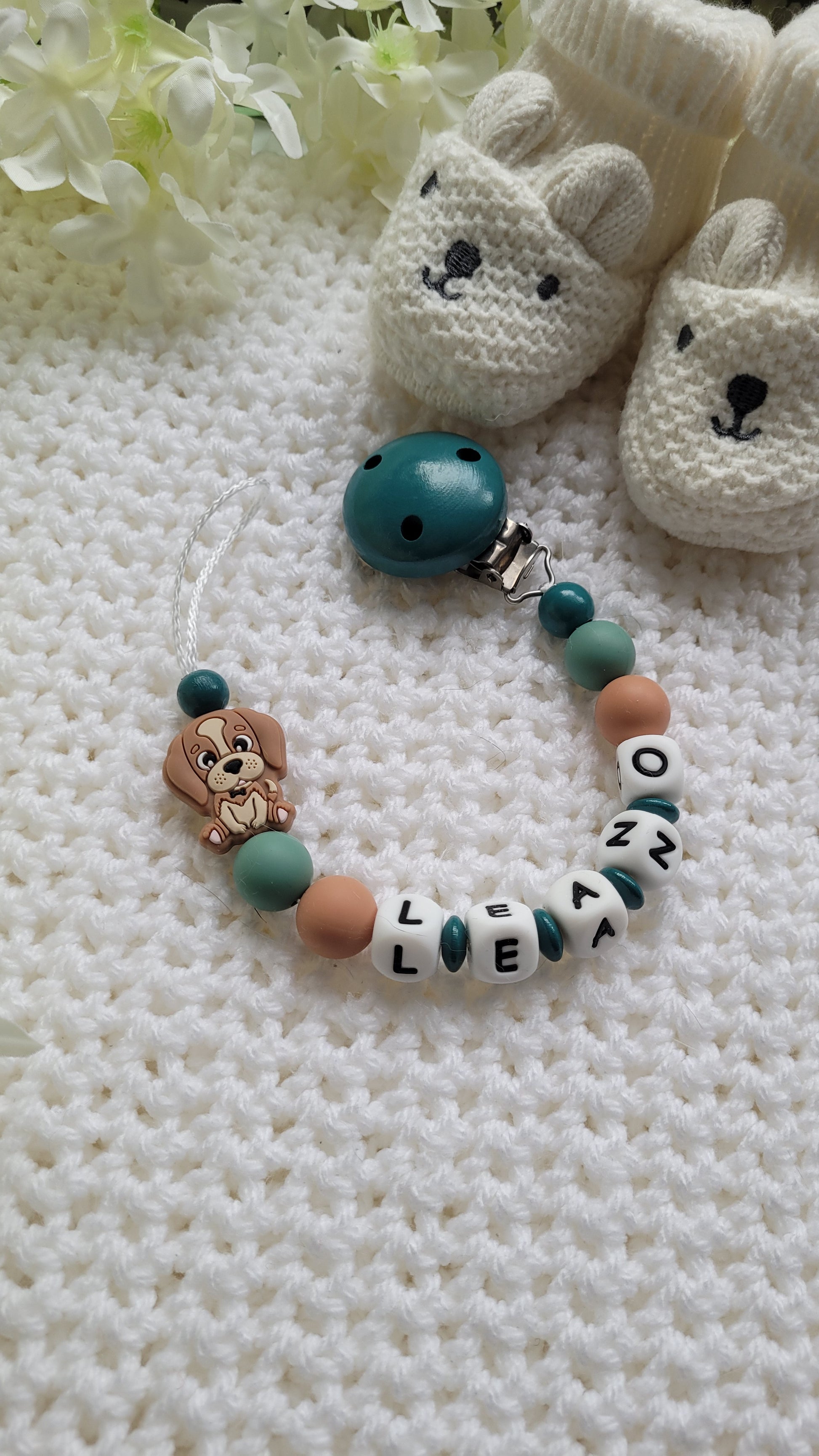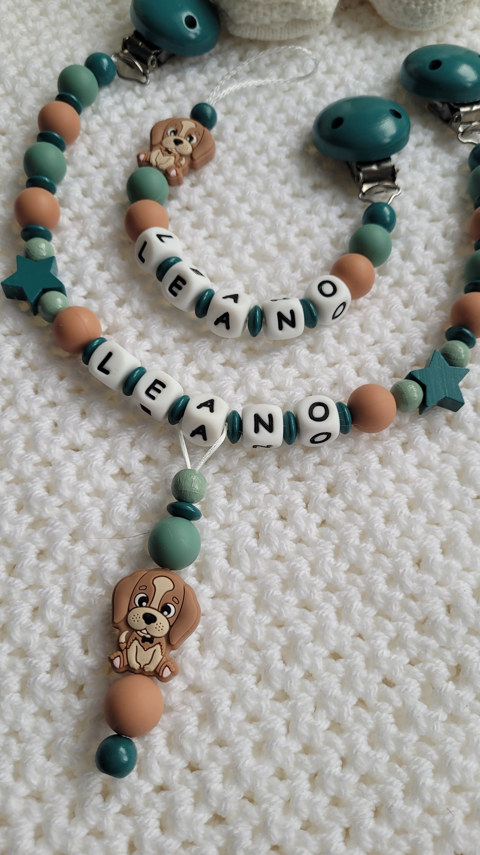 Kinderwagenkette & Schnullerkette Set Baby Hund für Jungen braun Salbei grün