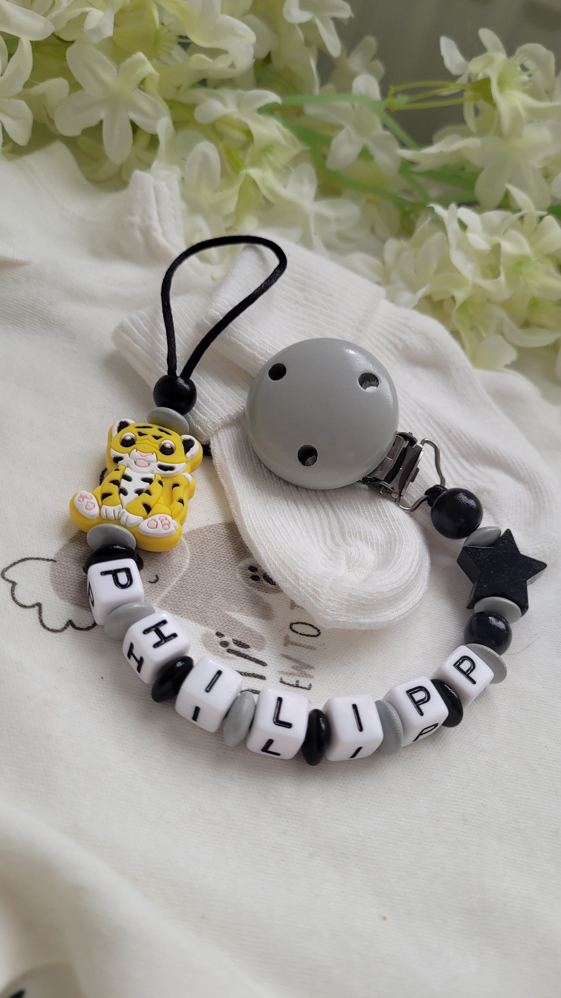 Schnullerkette mit Namen für Jungen Tiger grau schwarz