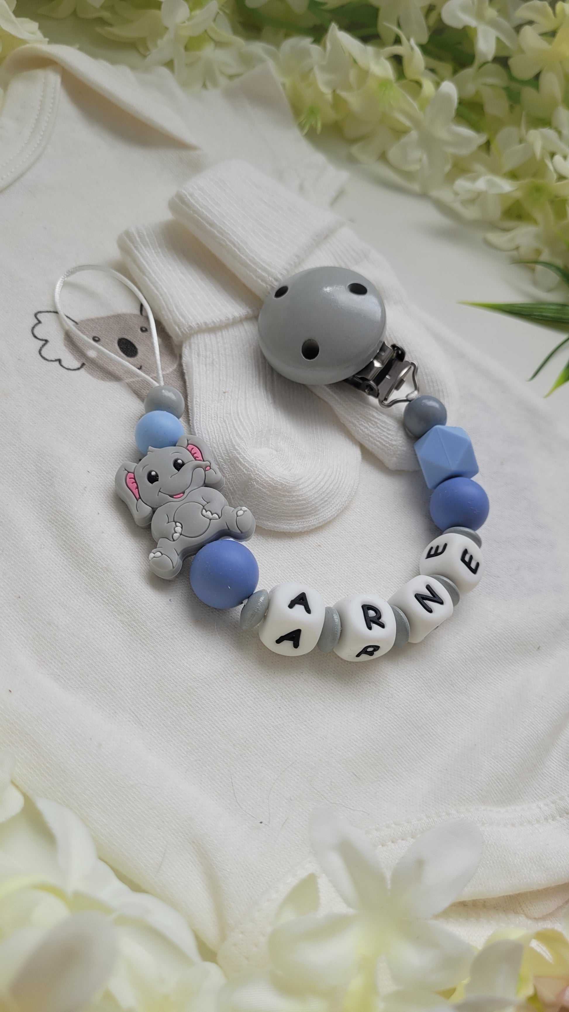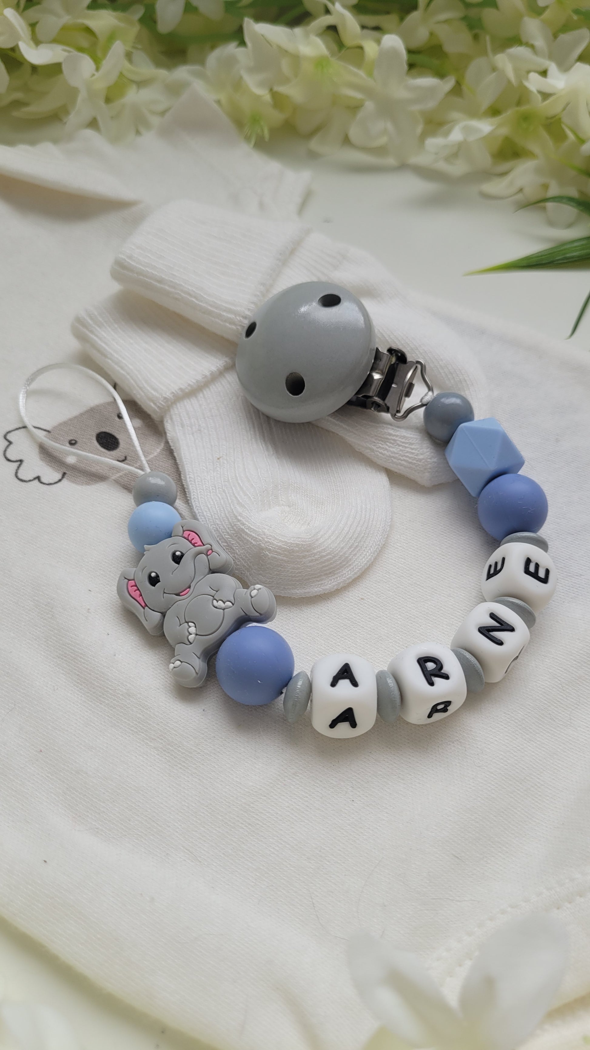 Niedliche Schnullerkette mit Elefant. Einfach traumhaft schön aus großen grauen und blauen Silikonperlen gearbeitet .