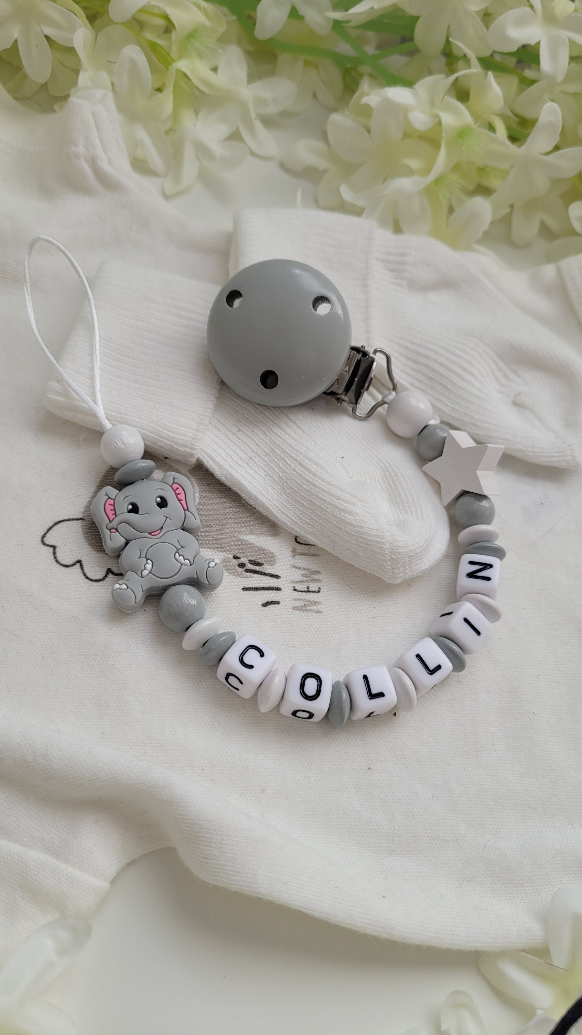 Schnullerkette mit Namen für Jungen Elefant grau weiss